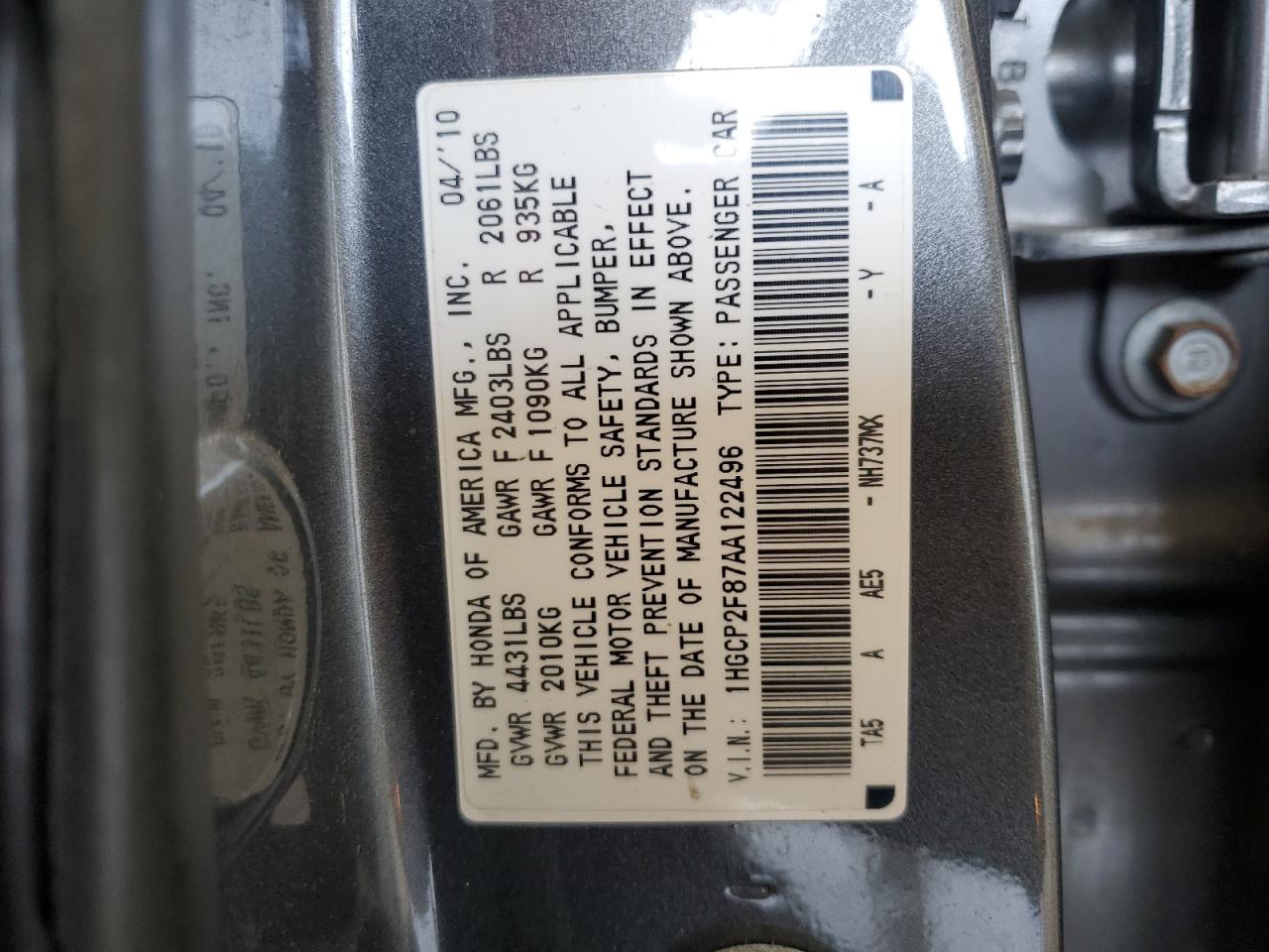 HONDA ACCORD 2.4 2010 г.в., (1HGCP2F87AA122496) из США