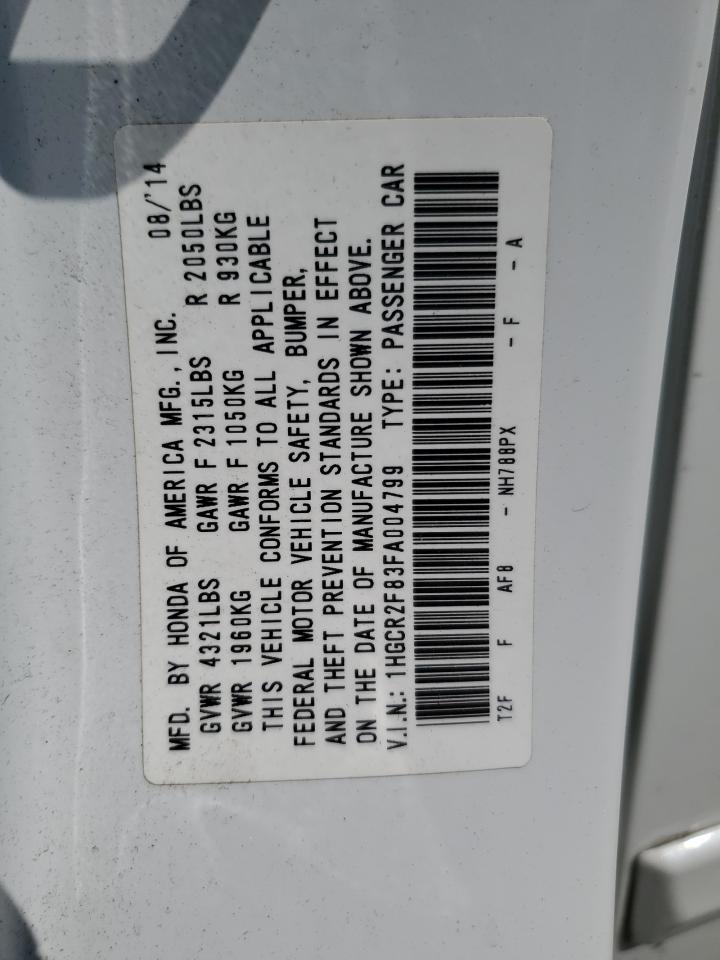 Цвет БелыйЦилиндры 4VIN 1HGCR2F83FA004799Состояние Заводится и едет (проверено)Повреждение По бокам