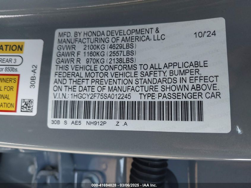 Цвет СерыйЦилиндры 4Привод Передний приводVIN 1HGCY2F75SA012245Состояние СтационарноПовреждение Передняя или задняя