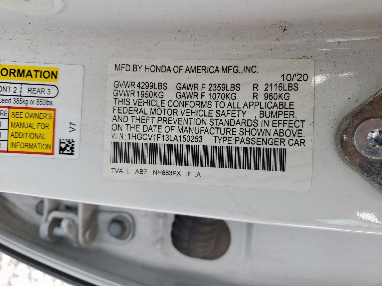 HONDA ACCORD 1.5 2020 г.в., (1HGCV1F13LA150253) из США