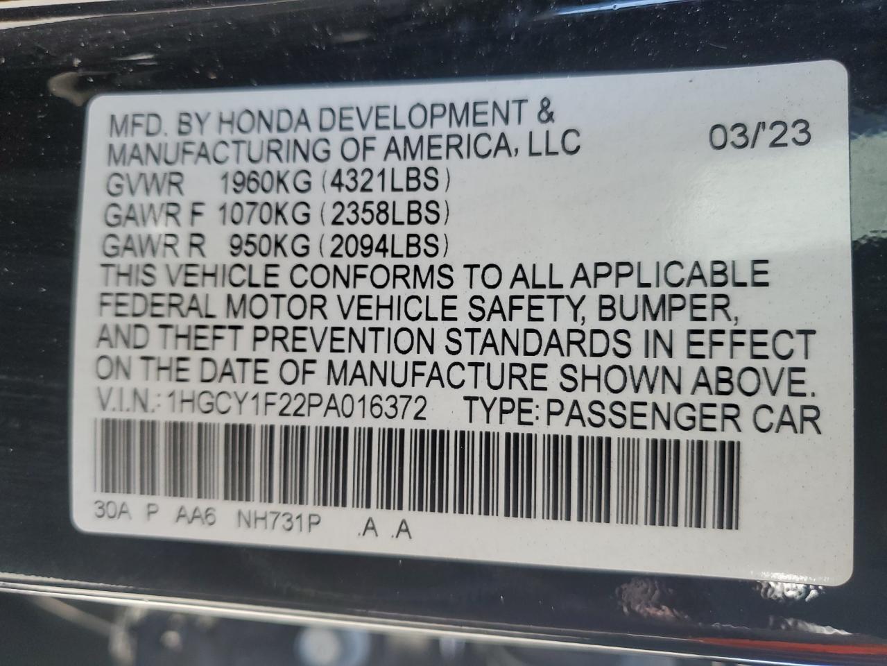 HONDA ACCORD 1.5 2023 г.в., (1HGCY1F22PA016372) из США