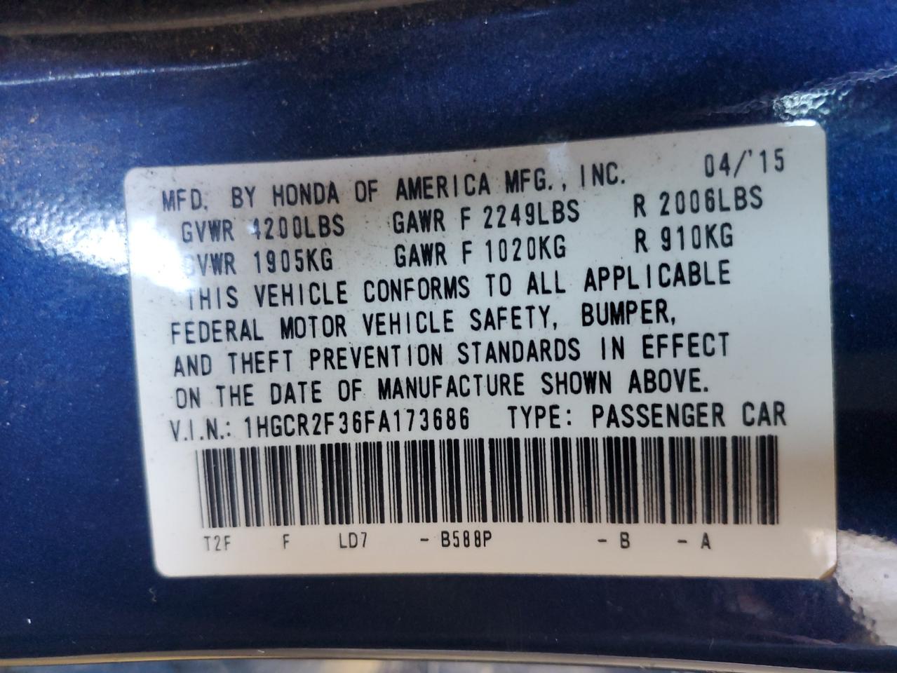 HONDA ACCORD 2.4 2015 г.в., (1HGCR2F36FA173686) из США