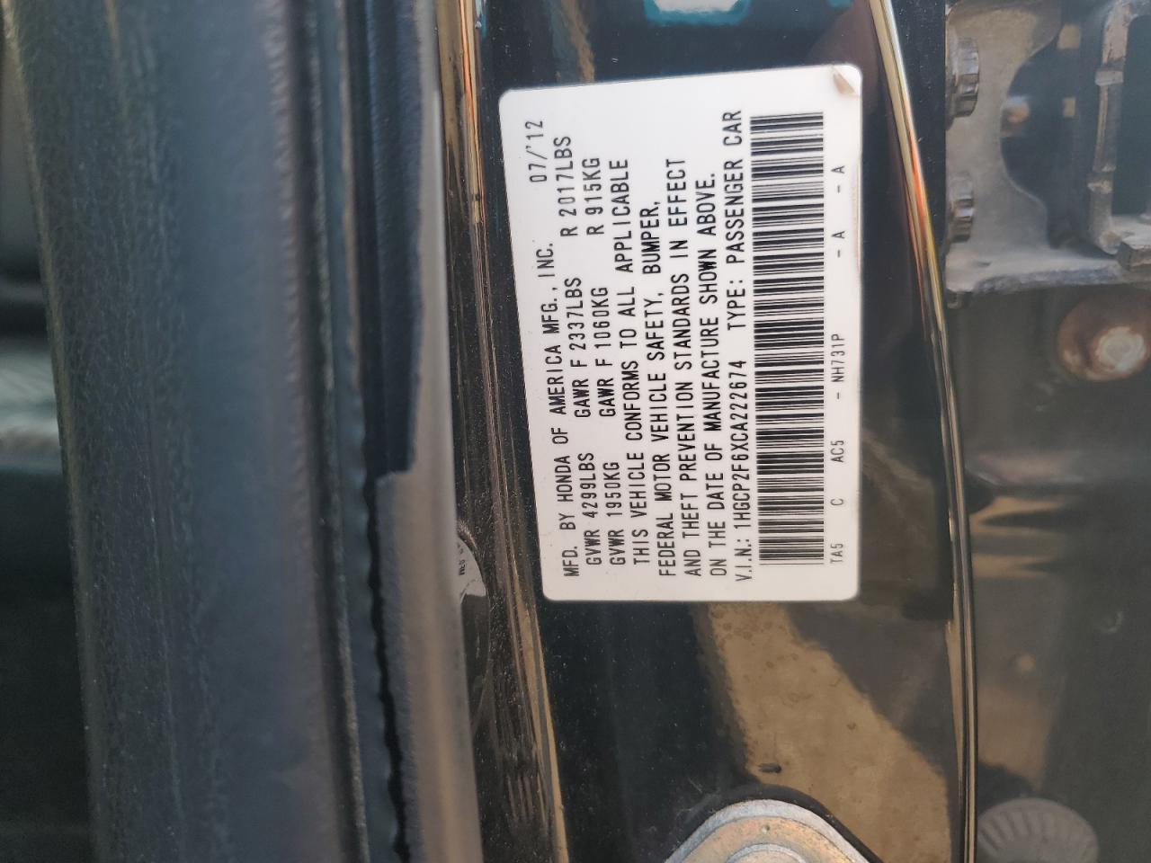 HONDA ACCORD 2.4 2012 г.в., (1HGCP2F6XCA222674) из США