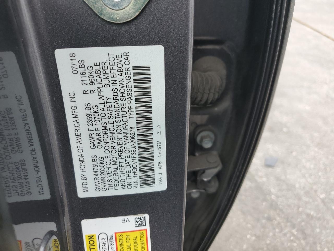 HONDA ACCORD 1.5 2018 г.в., (1HGCV1F36JA206278) из США
