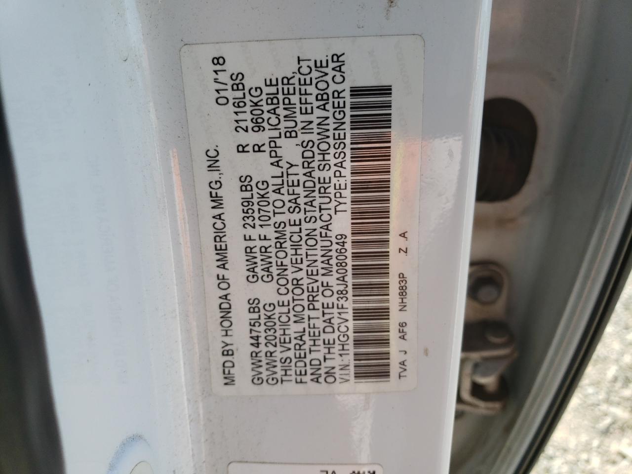 HONDA ACCORD 1.5 2018 г.в., (1HGCV1F38JA080649) из США