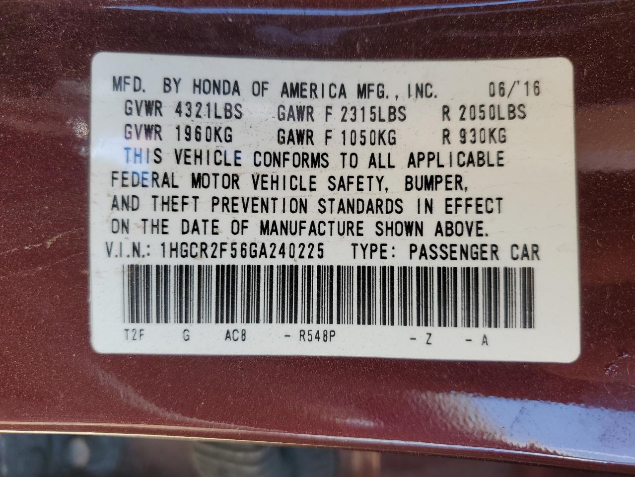 HONDA ACCORD 2.4 2016 г.в., (1HGCR2F56GA240225) из США