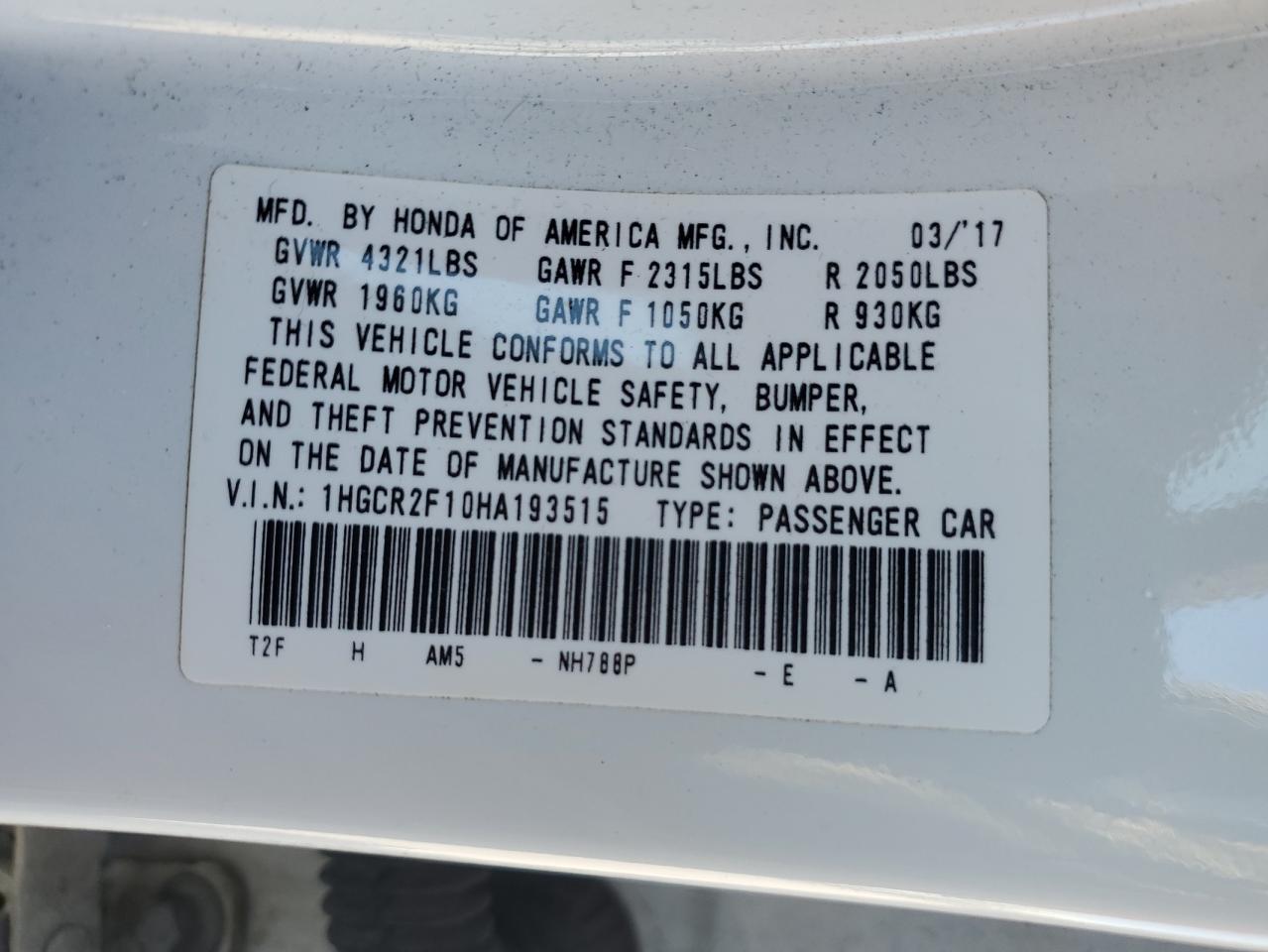 HONDA ACCORD 2.4 2017 г.в., (1HGCR2F10HA193515) из США