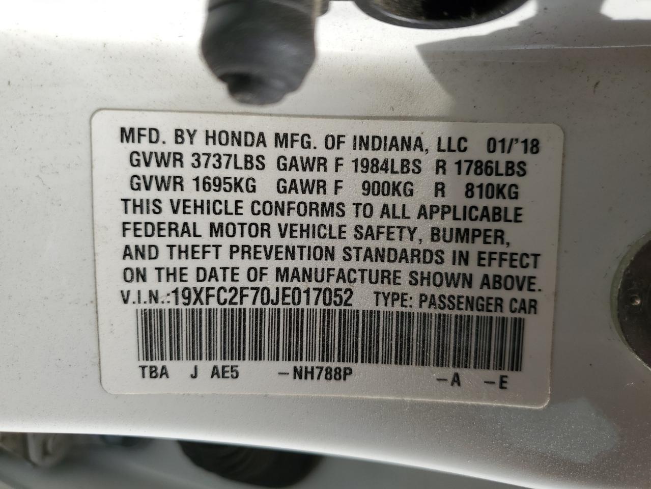 HONDA CIVIC 2.0 2018 г.в., (19XFC2F70JE017052) из США