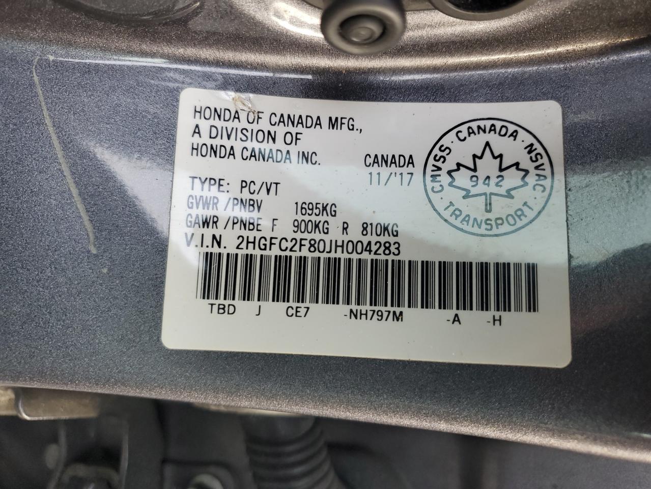 Цвет СерыйЦилиндры 4VIN 2HGFC2F80JH004283Состояние Заводится и едет (проверено)Повреждение Передняя или задняя