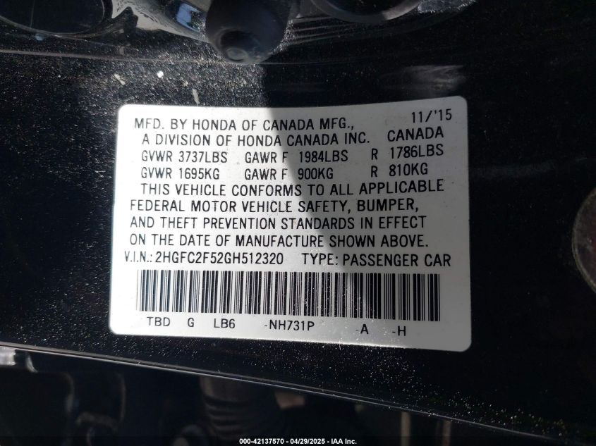 HONDA CIVIC 2.0 2016 г.в., Передний привод (2HGFC2F52GH512320) из США