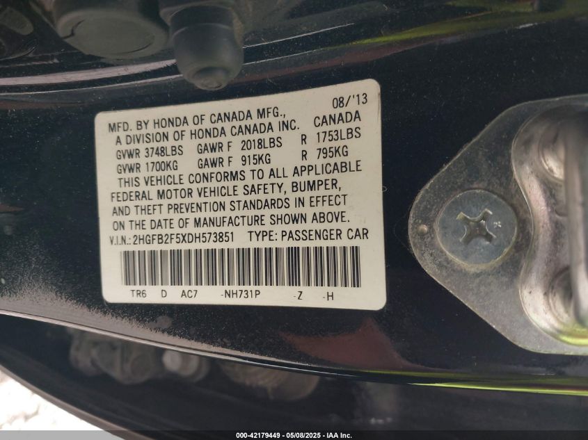 HONDA CIVIC 1.8 2013 г.в., Передний привод (2HGFB2F5XDH573851) из США