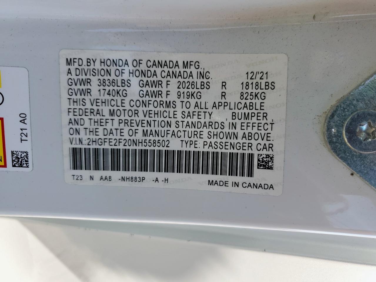 HONDA CIVIC 2.0 2022 г.в., (2HGFE2F20NH558502) из США
