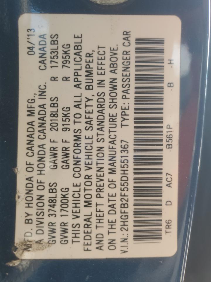 HONDA CIVIC 1.8 2013 г.в., (2HGFB2F55DH551367) из США
