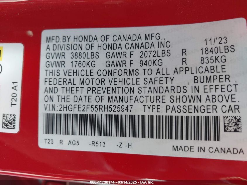 HONDA CIVIC 2.0 2024 г.в., Передний привод (2HGFE2F55RH525947) из США