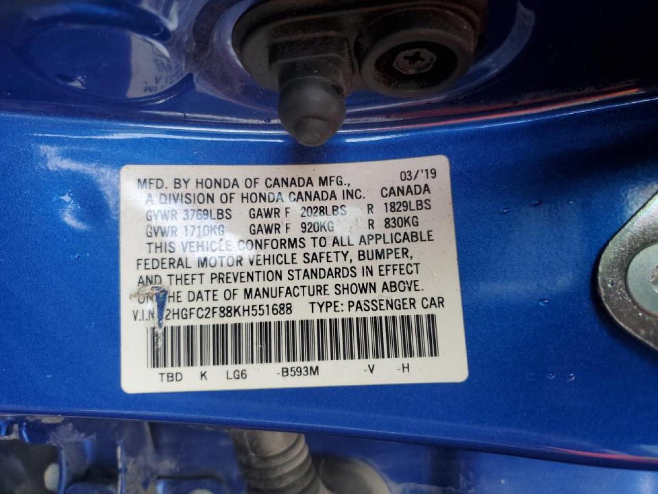 Цвет СинийЦилиндры 4VIN 2HGFC2F88KH551688Состояние НеизвестноПовреждение Передняя или задняяДата аукциона 2025-11-25