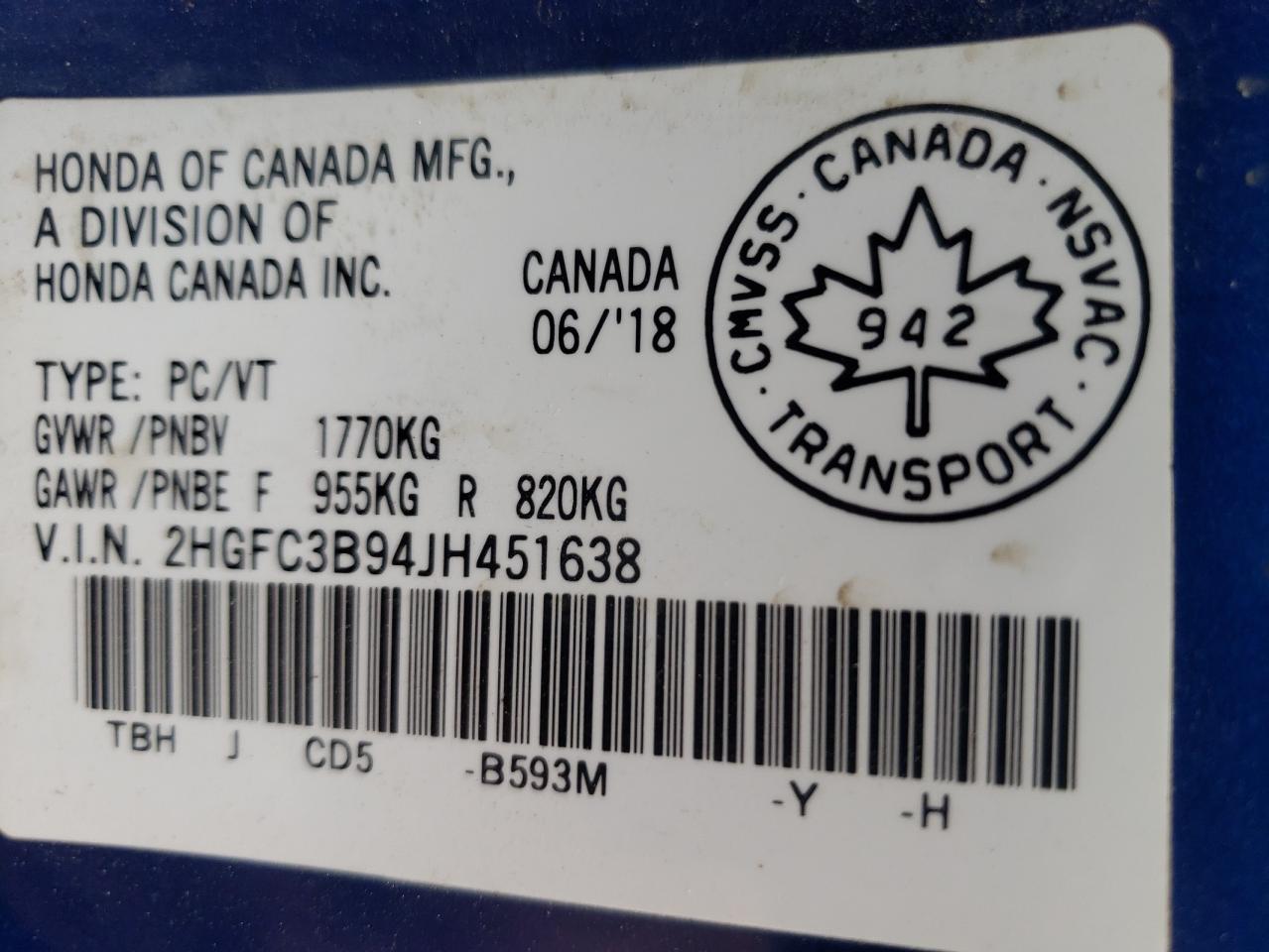 HONDA CIVIC 1.5 2018 г.в., (2HGFC3B94JH451638) из США