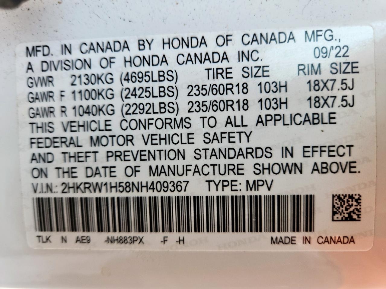 HONDA CR-V 1.5 2022 г.в., (2HKRW1H58NH409367) из США