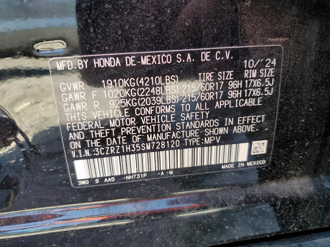 HONDA HR-V 2.0 2025 г.в., (3CZRZ1H35SM728120) из США