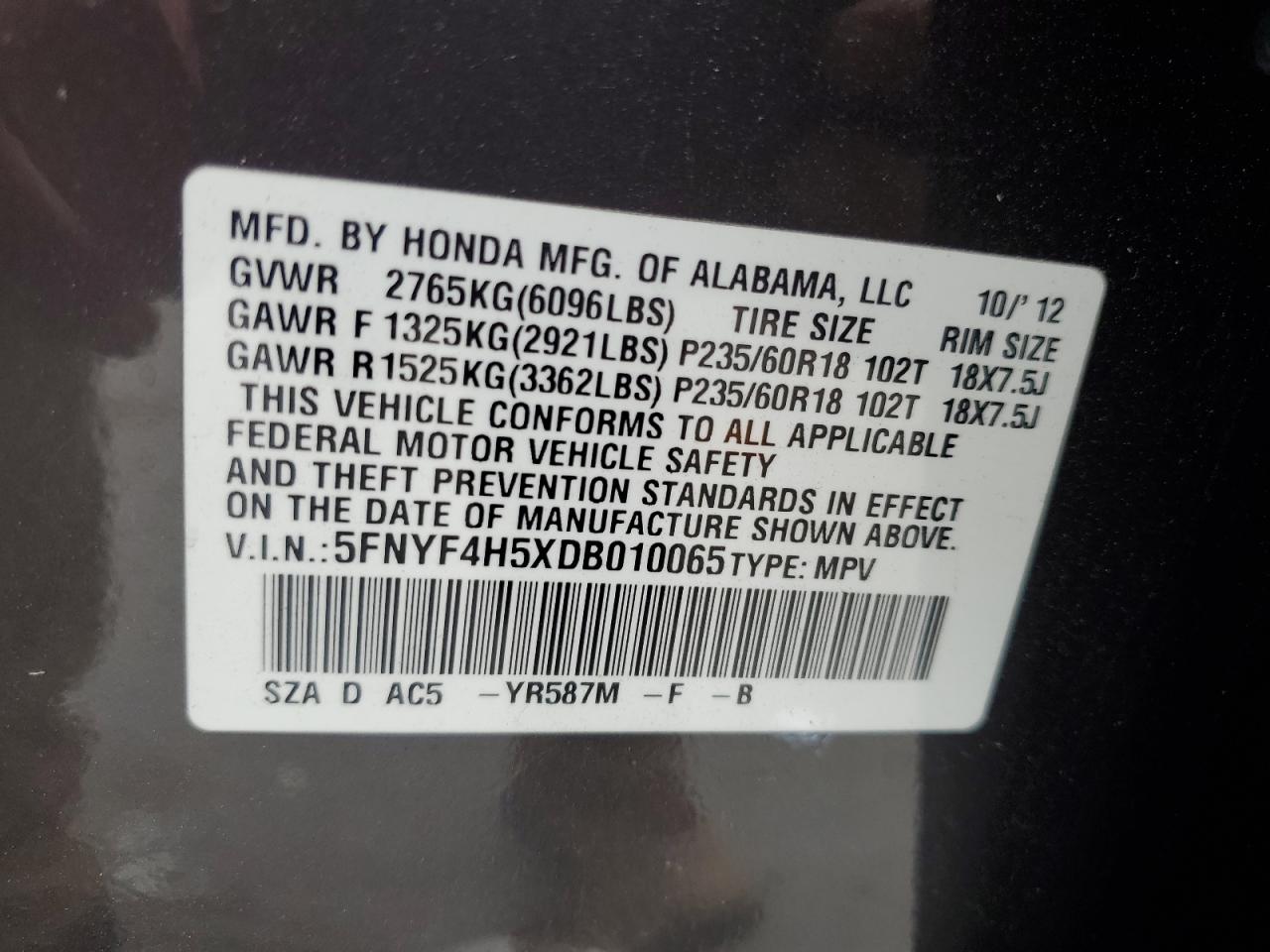 Цвет СерыйЦилиндры 6Привод Полный приводVIN 5FNYF4H5XDB010065Состояние ЗаводитсяПовреждение Передняя или задняяДата аукциона 2025-11-05