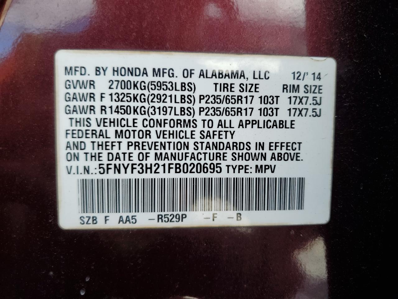 HONDA PILOT 3.5 2015 г.в., (5FNYF3H21FB020695) из США