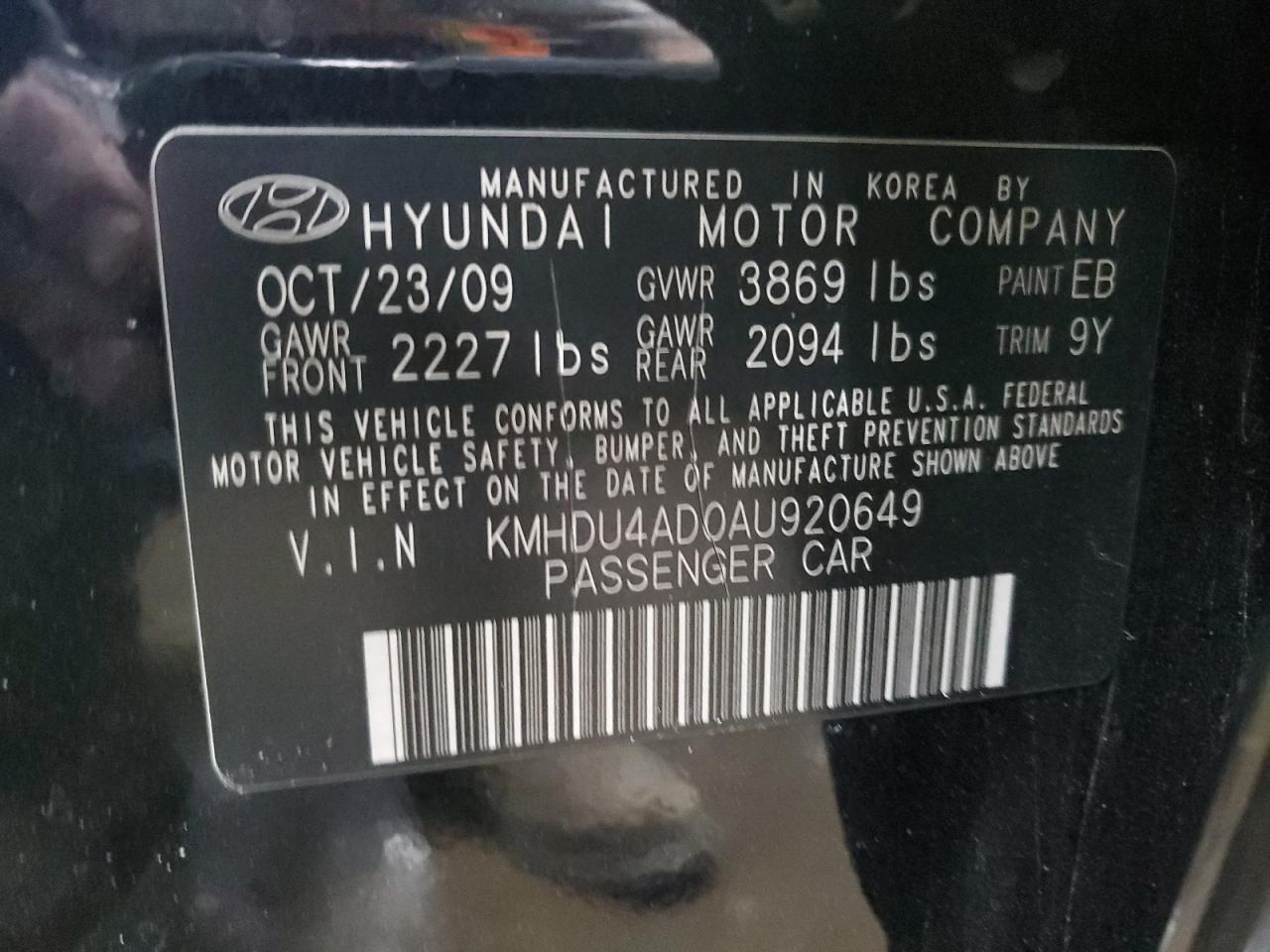 HYUNDAI ELANTRA 2.0 2010 г.в., (KMHDU4AD0AU920649) из США