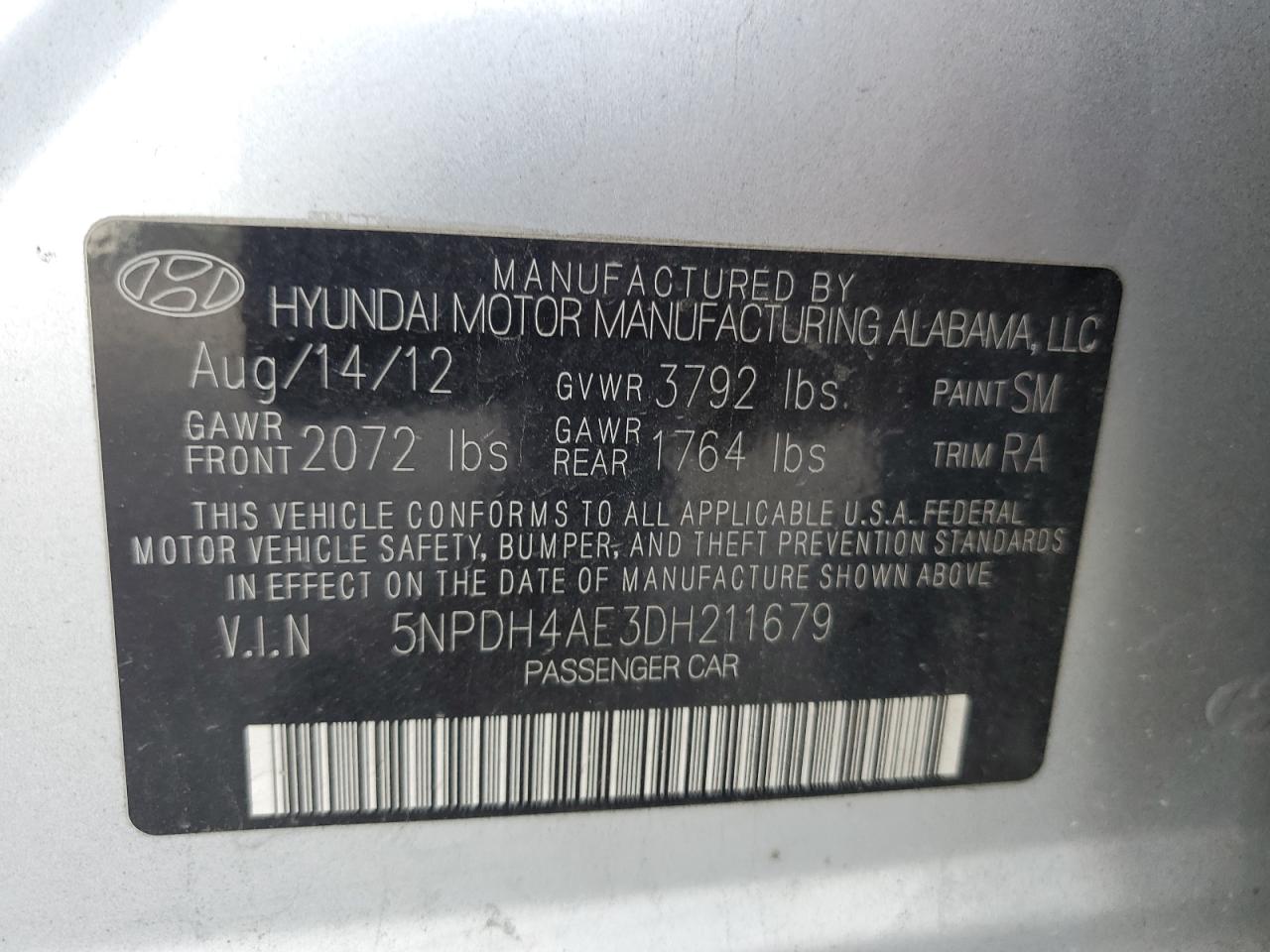 HYUNDAI ELANTRA 1.8 2013 г.в., (5NPDH4AE3DH211679) из США