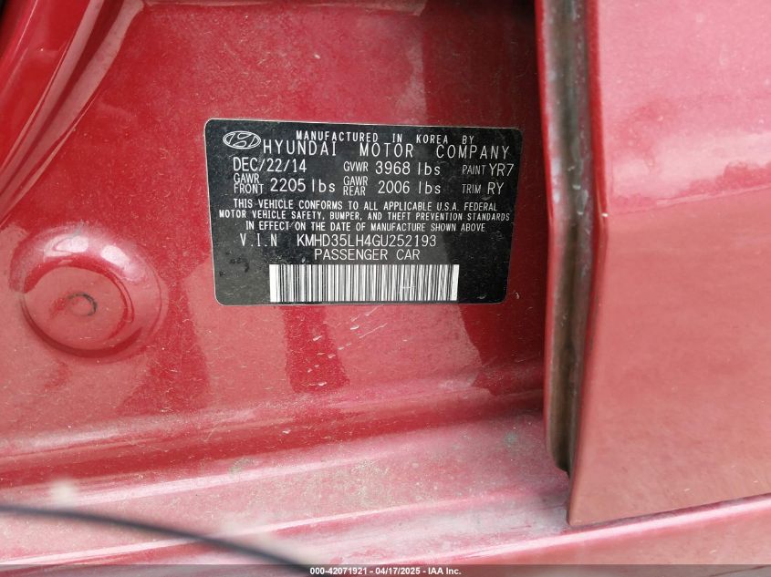 HYUNDAI ELANTRA 2.0 2016 г.в., Передний привод (KMHD35LH4GU252193) из США