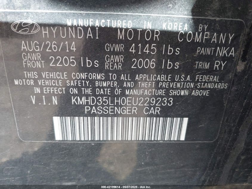 HYUNDAI ELANTRA 2.0 2014 г.в., Передний привод (KMHD35LH0EU229233) из США