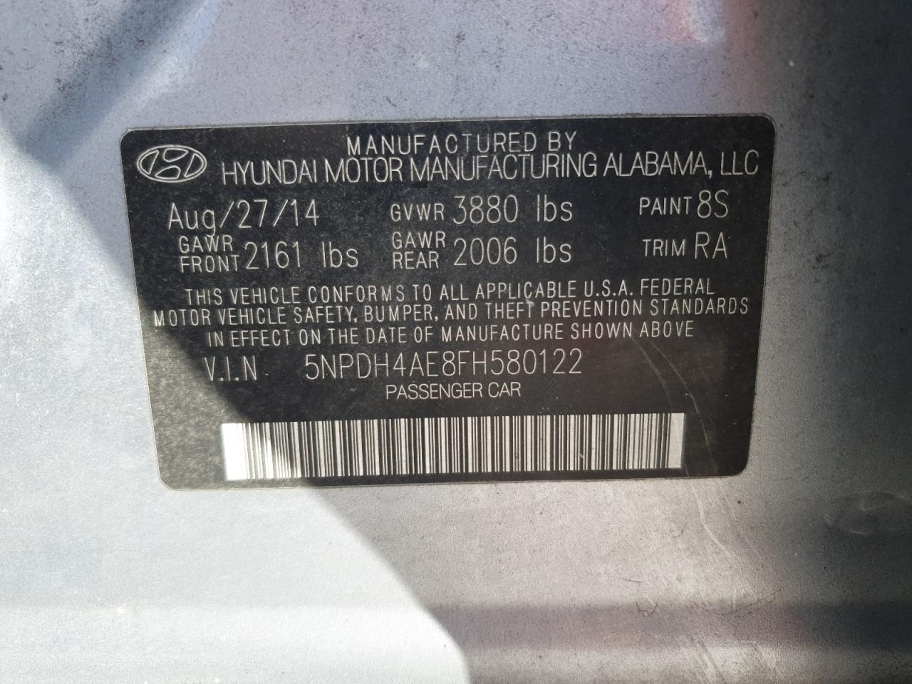 HYUNDAI ELANTRA 1.8 2015 г.в., (5NPDH4AE8FH580122) из США