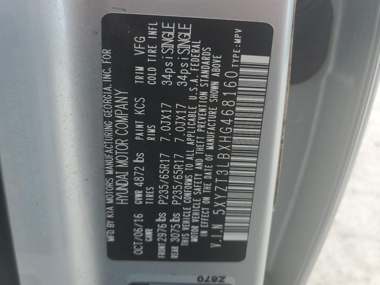 HYUNDAI SANTA FE 2.4 2017 г.в., (5XYZT3LBXHG468160) из США