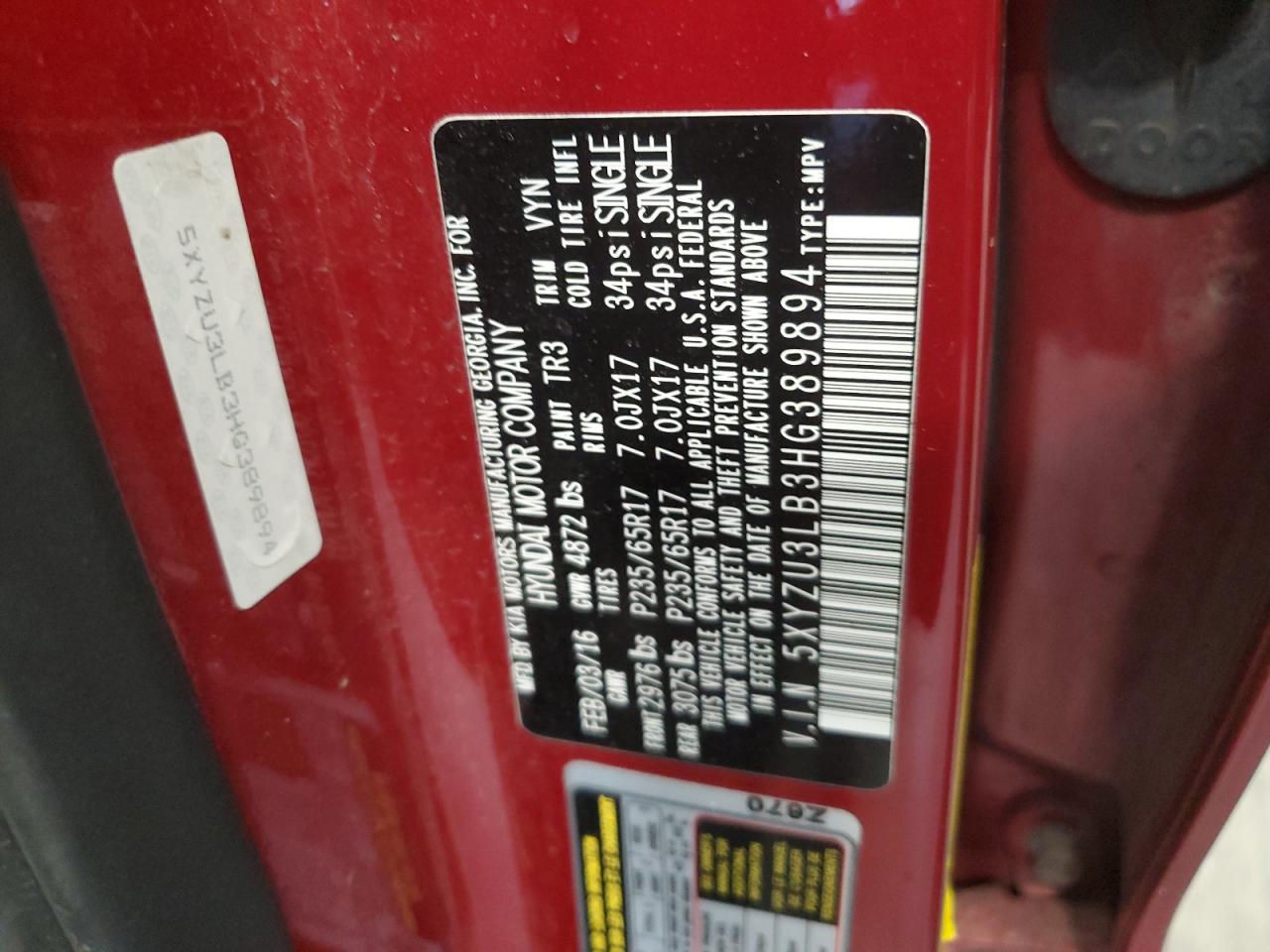 HYUNDAI SANTA FE 2.4 2017 г.в., (5XYZU3LB3HG389894) из США