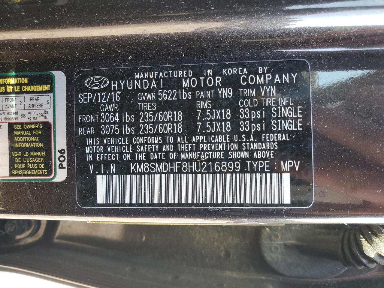HYUNDAI SANTA FE 3.3 2017 г.в., Полный привод (KM8SMDHF8HU216899) из США