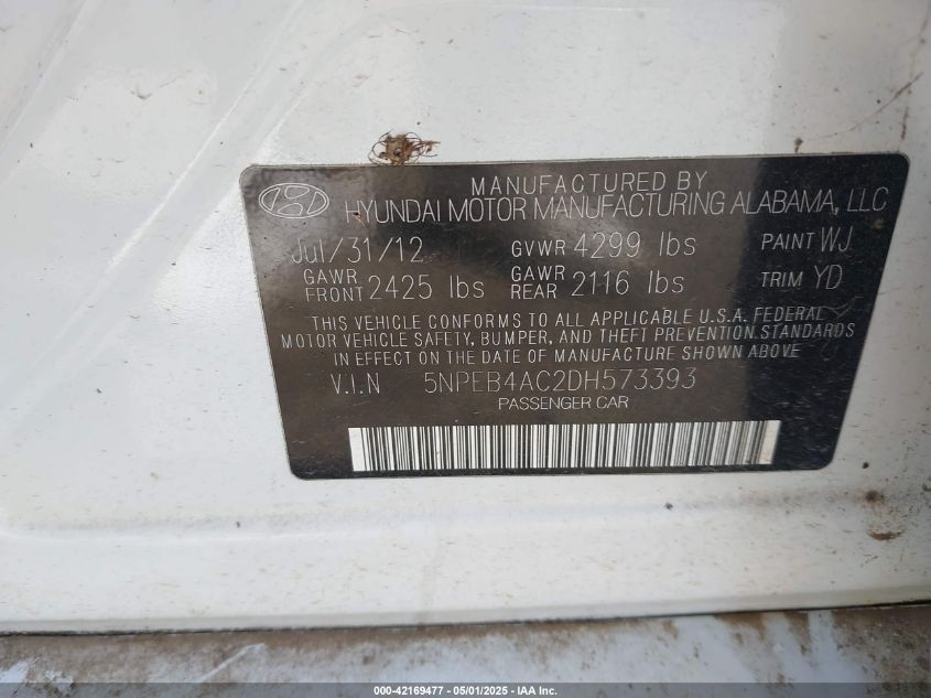 HYUNDAI SONATA 2.4 2013 г.в., Передний привод (5NPEB4AC2DH573393) из США