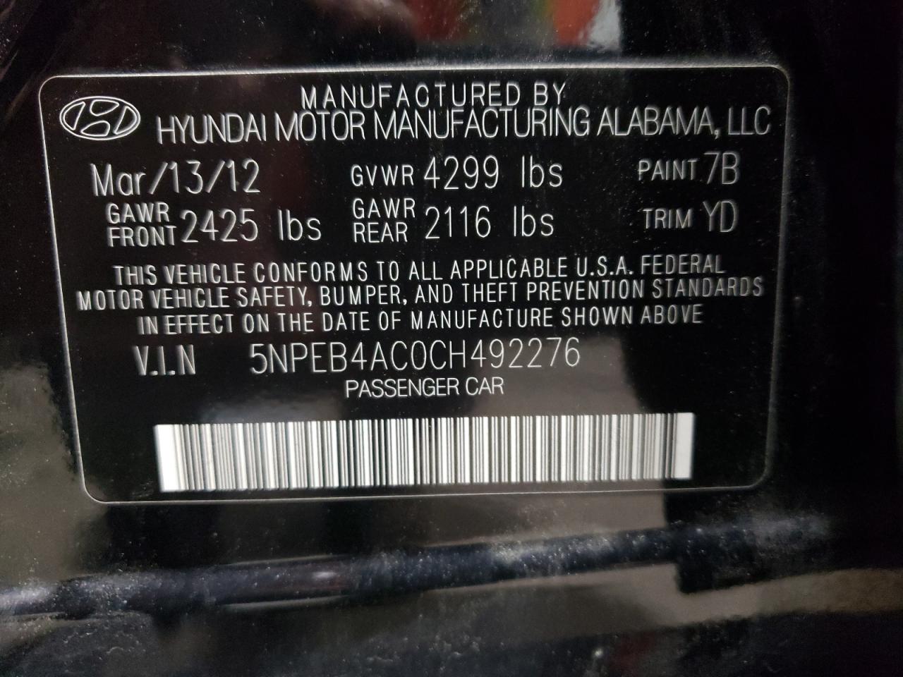 HYUNDAI SONATA 2.4 2012 г.в., (5NPEB4AC0CH492276) из США
