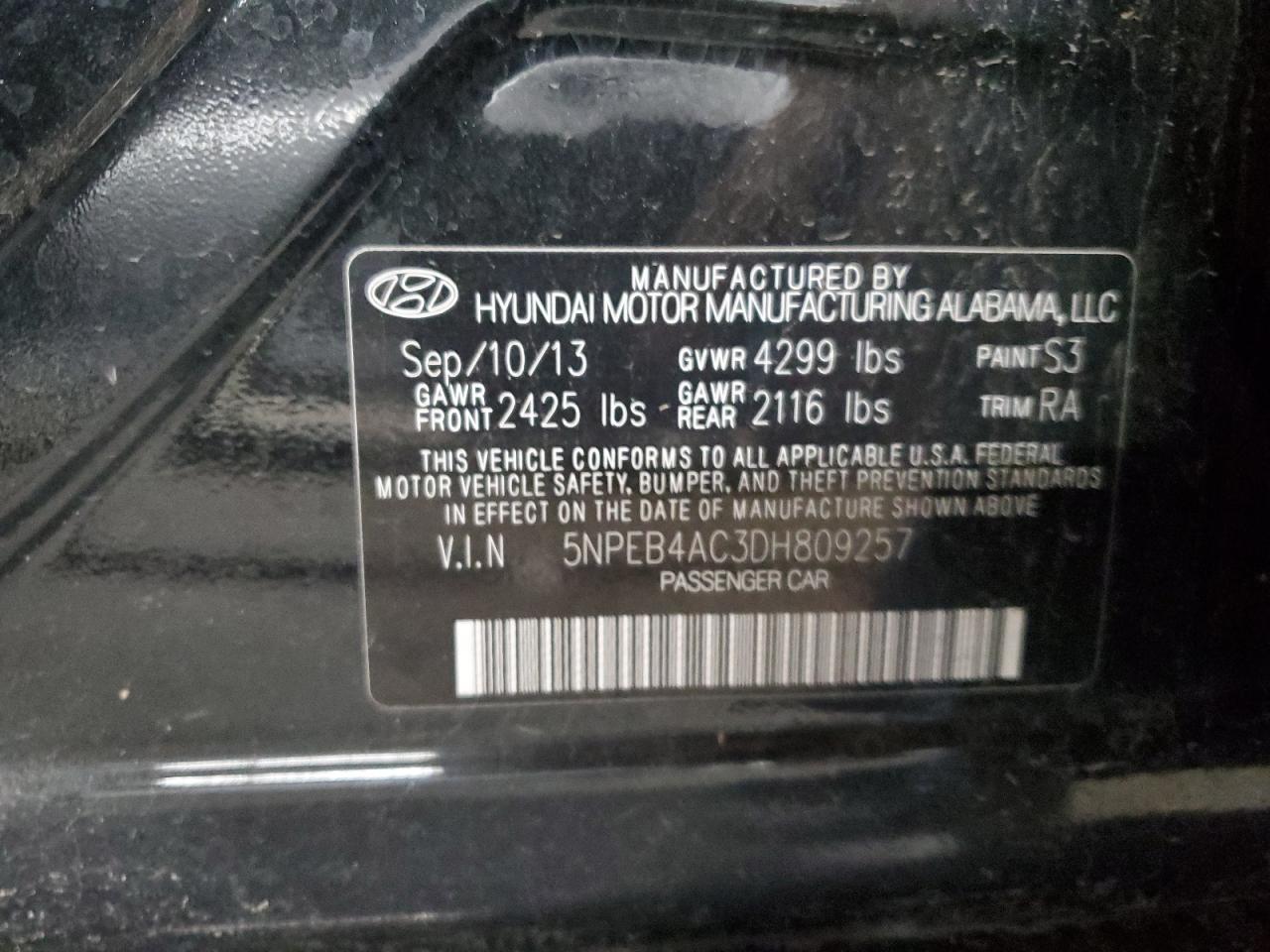 HYUNDAI SONATA 2.4 2013 г.в., (5NPEB4AC3DH809257) из США