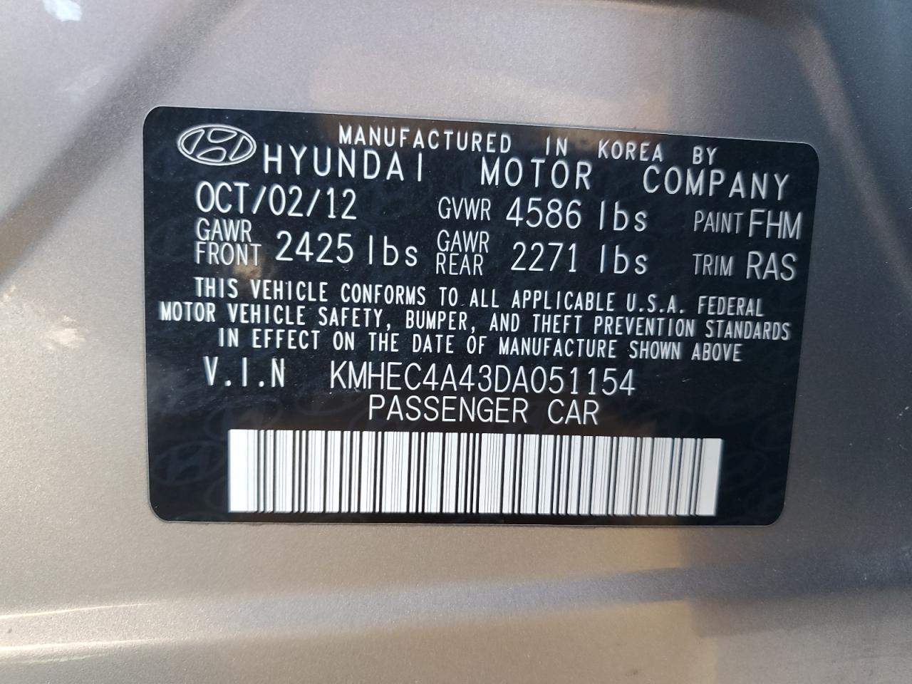 HYUNDAI SONATA 2.4 2013 г.в., (KMHEC4A43DA051154) из США