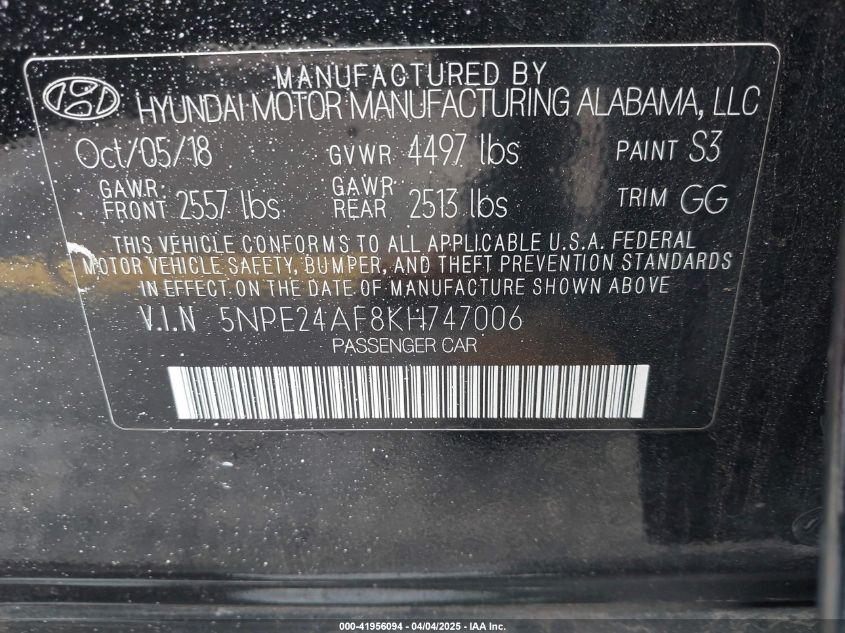 HYUNDAI SONATA 2.4 2019 г.в., Передний привод (5NPE24AF8KH747006) из США