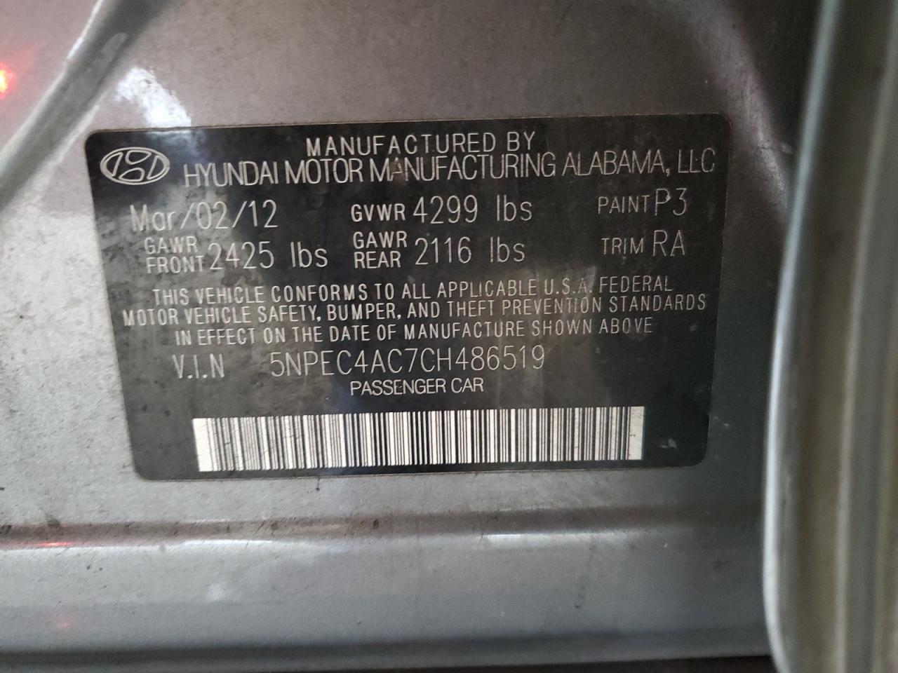 HYUNDAI SONATA 2.4 2012 г.в., (5NPEC4AC7CH486519) из США