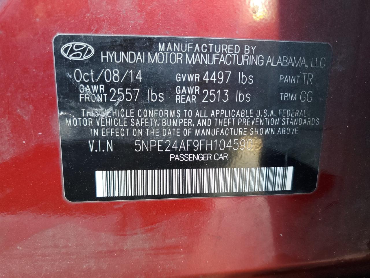 HYUNDAI SONATA 2.4 2015 г.в., (5NPE24AF9FH104590) из США
