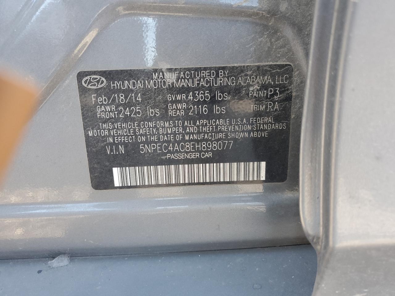 HYUNDAI SONATA 2.4 2014 г.в., (5NPEC4AC8EH898077) из США