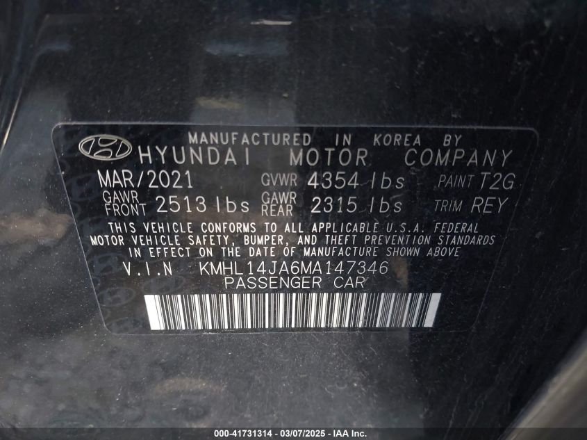 HYUNDAI SONATA 2.5 2021 г.в., Передний привод (KMHL14JA6MA147346) из США