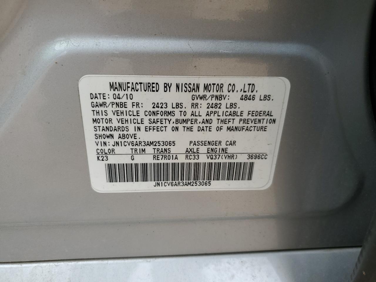 Цвет СеребряныйЦилиндры 6Привод Полный приводVIN JN1CV6AR3AM253065Состояние НеизвестноПовреждение Передняя или задняяДата аукциона 2025-11-06