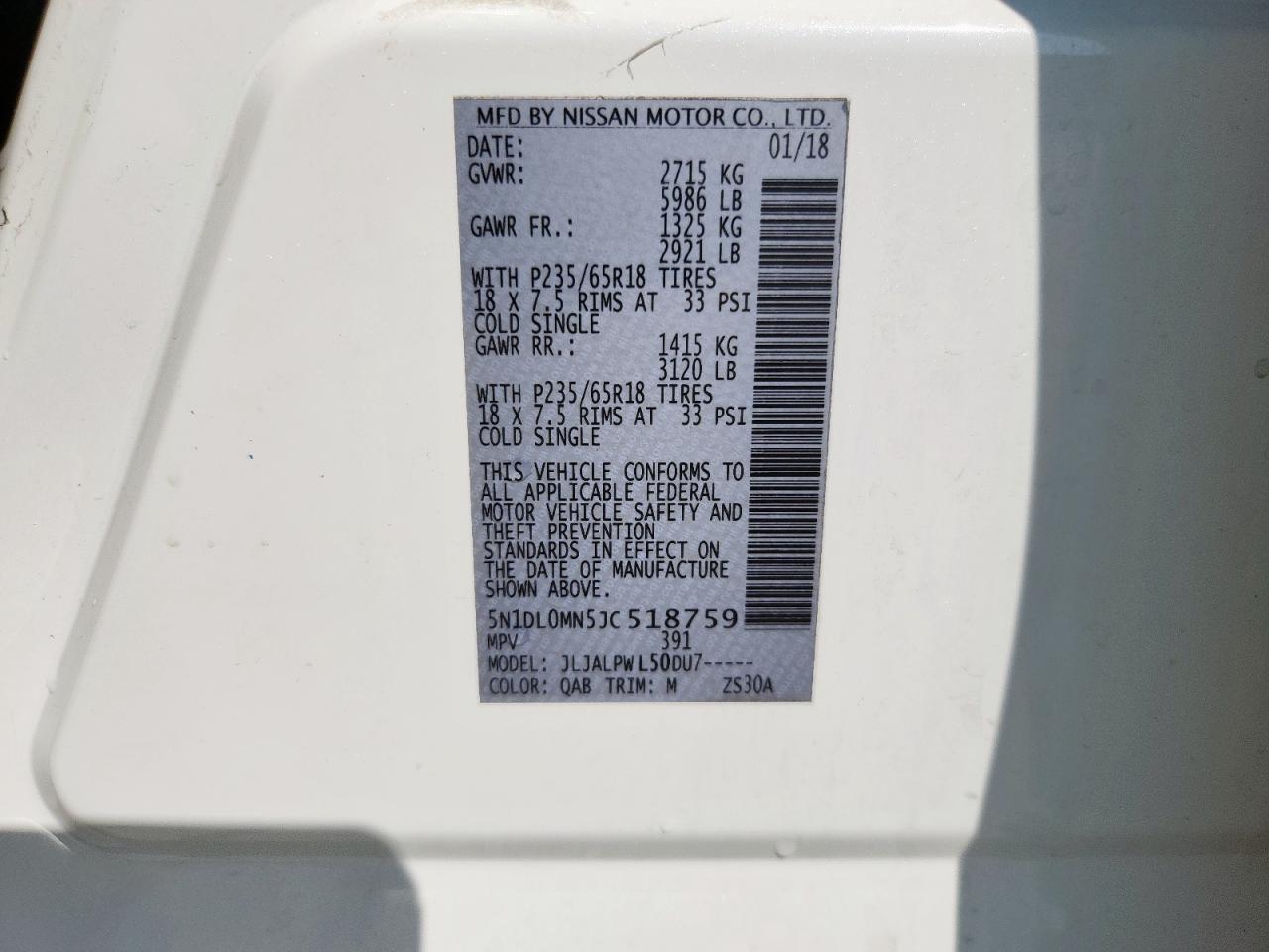 Цвет БелыйЦилиндры 6VIN 5N1DL0MN5JC518759Состояние Заводится и едет (проверено)Повреждение Задняя