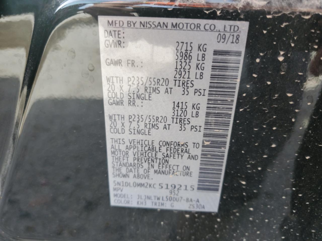 Цвет ЧерныйЦилиндры 6Привод Полный приводVIN 5N1DL0MM2KC519215Состояние Заводится и едет (проверено)Повреждение Передняя или задняя