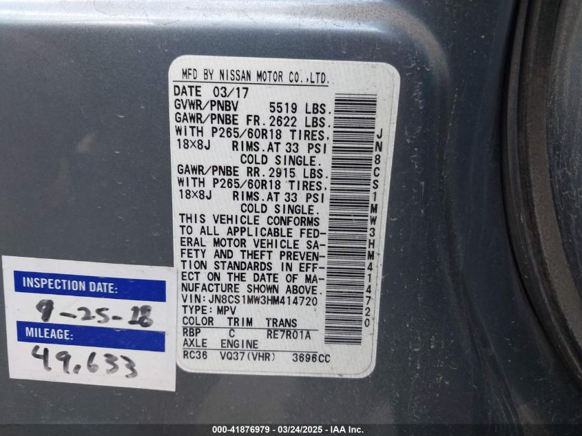 Цвет СинийЦилиндры 6Привод Полный приводVIN JN8CS1MW3HM414720Состояние СтационарноПовреждение Передняя или задняя