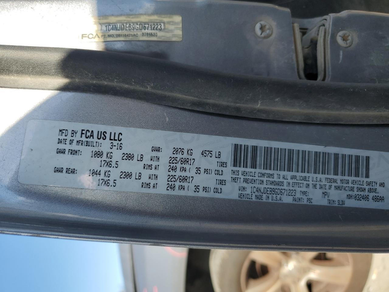 JEEP COMPASS 2.4 2016 г.в., 4x4 с передним приводом (1C4NJDEB9GD671223) из США