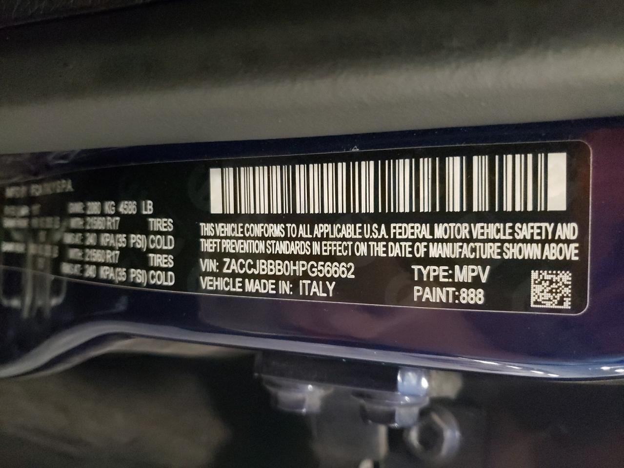 Цвет СинийЦилиндры 4Привод 4x4 с передним приводомVIN ZACCJBBB0HPG56662Состояние Заводится и едет (проверено)Повреждение Передняя или задняяДата аукциона 2025-11-10