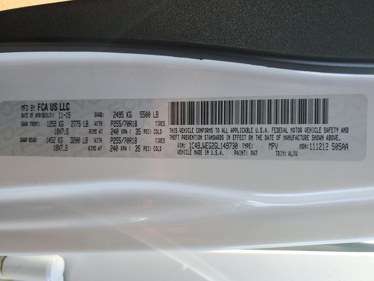 JEEP WRANGLER 3.6 2016 г.в., 4x4 с задним приводом (1C4BJWEG2GL149730) из США
