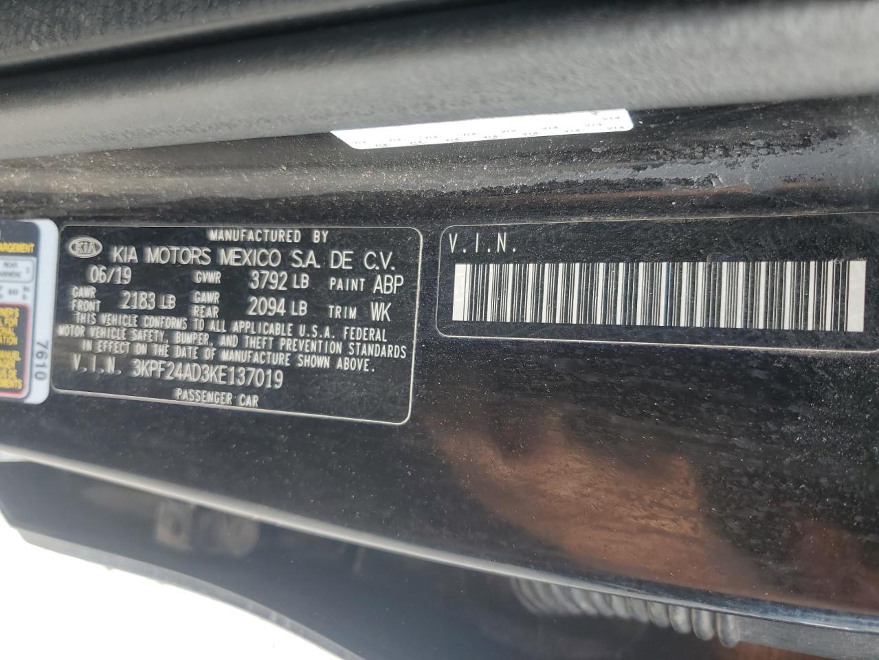 KIA FORTE 2.0 2019 г.в., (3KPF24AD3KE137019) из США