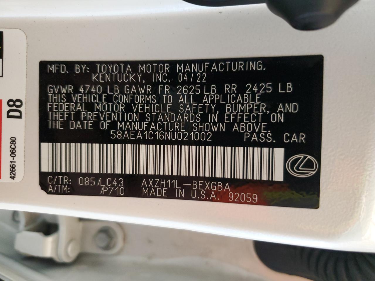 LEXUS ES 300H 2.5 2022 г.в., (58AEA1C16NU021002) из США